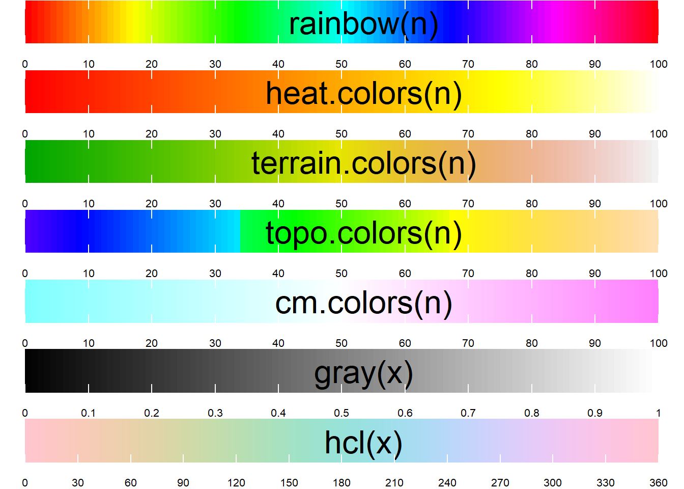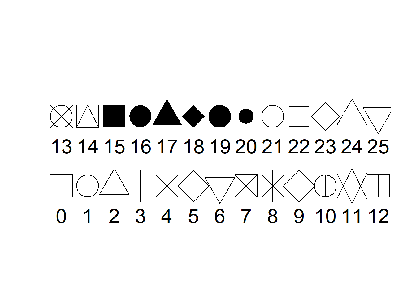 我初学 R 的时候用 plot() 作图时, 常常忘记不同形状数据点(pch)对应的编号, 实线虚线(lty)的编号, 散点图类型(type)的代码, 以及最难选择的颜色代码. 每次忘了都要上网搜一下. 现在, beginr 里提供了 plotpch(), plotlty(), plottype(), plotcolors(), plotcolorbar()等函数, 想不起来的时候运行一下就行了.