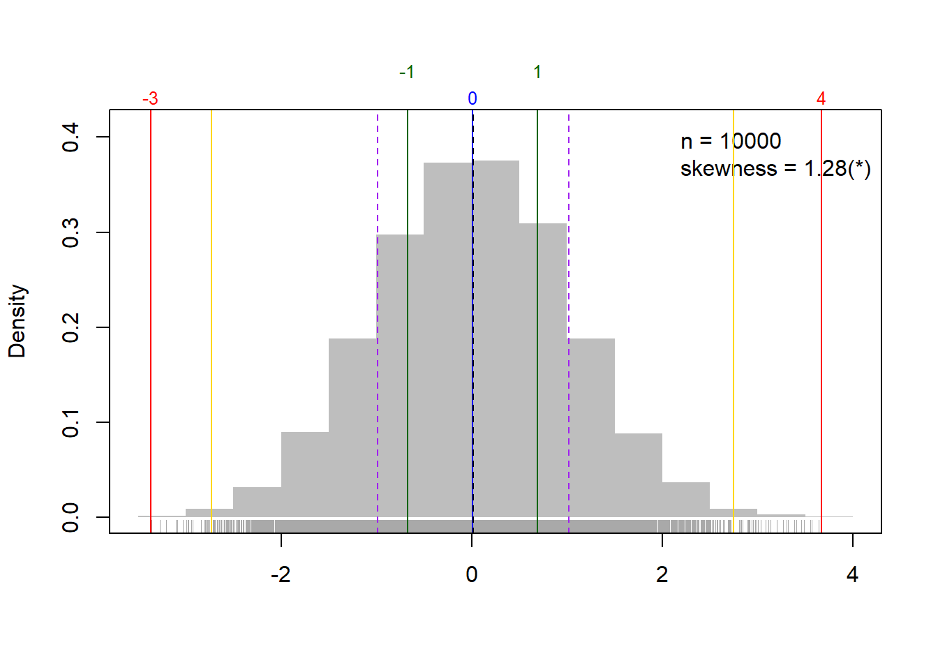 经常需要了解一组数据的分布, 看看是不是正态分布. beginr 里的 plothist() 函数不仅做出直方图和平滑曲线, 并且标出中值, 中位数, 四分位数, 标准偏差, 样本数, 以及用来判断是否正态分布的 skewness 值.