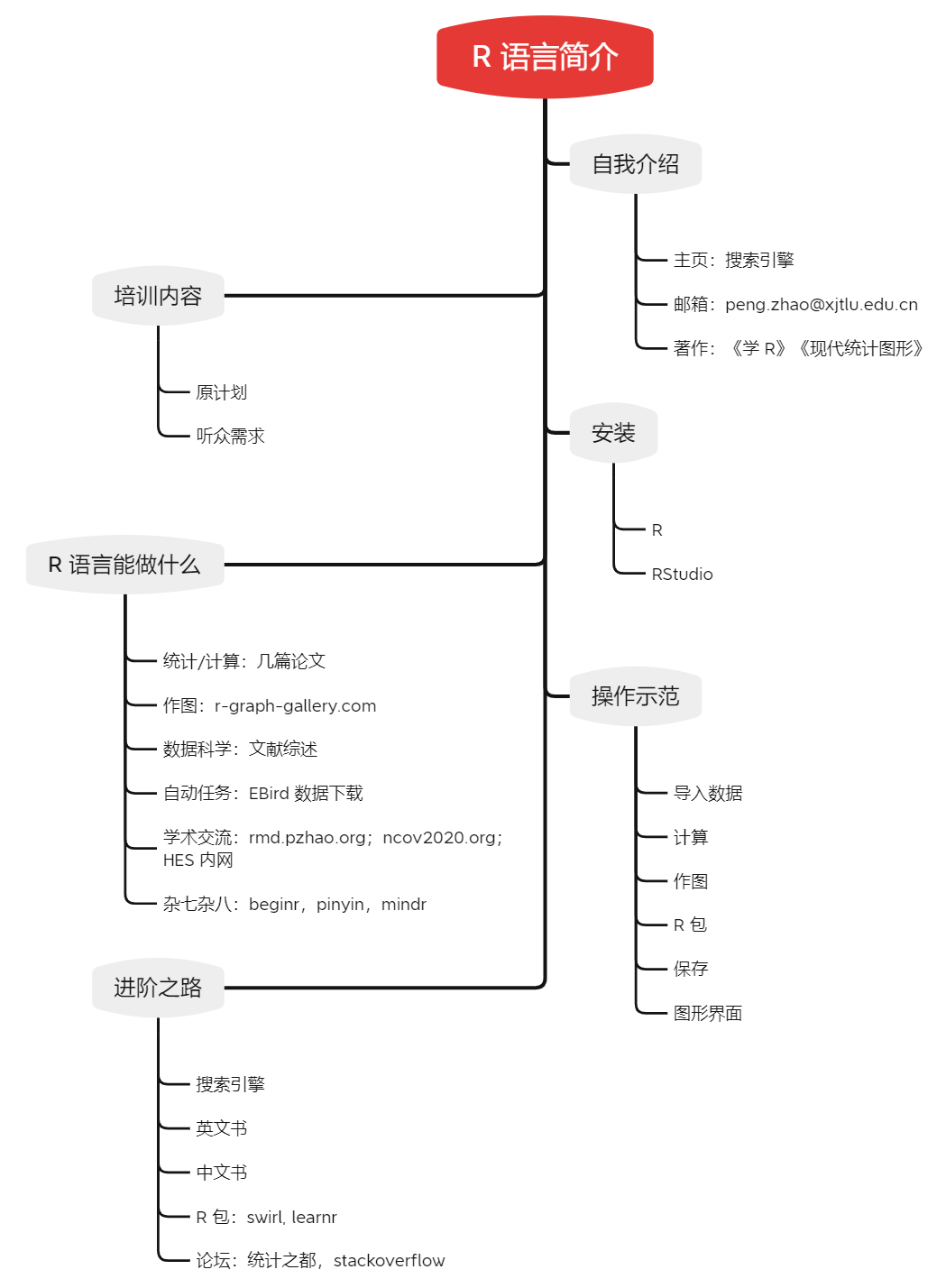 这个报名的网页上有个培训内容介绍,这是最初的计划。不过,我发现报名的人里,有零基础的,也有熟悉 R 语言却想进一步了解的,而最初的培训计划只针对前者。所以,我决定修改一下培训内容,让不同水平的听众都不白来。最新的培训提纲如下图: